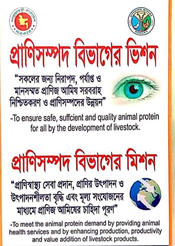 অভিলক্ষ্য (Mission) :প্রাণিসম্পদের উৎপাদন ও উৎপাদনশীলতা বৃদ্ধি এবং মূল্য সংযোজনের (Value addition) মাধ্যমে প্রাণিজ আমিষের চাহিদাপুরণ।